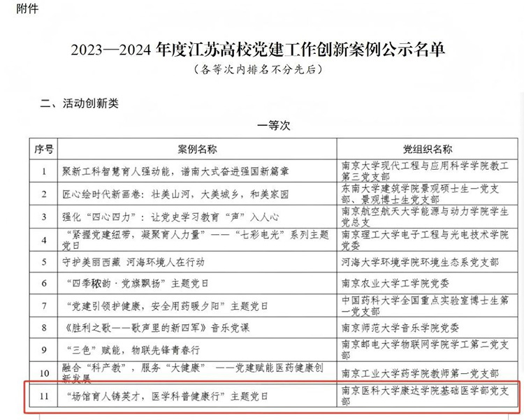 近日,省委教育工委公布了2023—2024年度江苏高校党建工作创新案例评选结果,我院基础医学部党支部《“场馆育人铸英才,医学科普健康行”主题党日》获评活动创新类一等次。