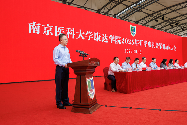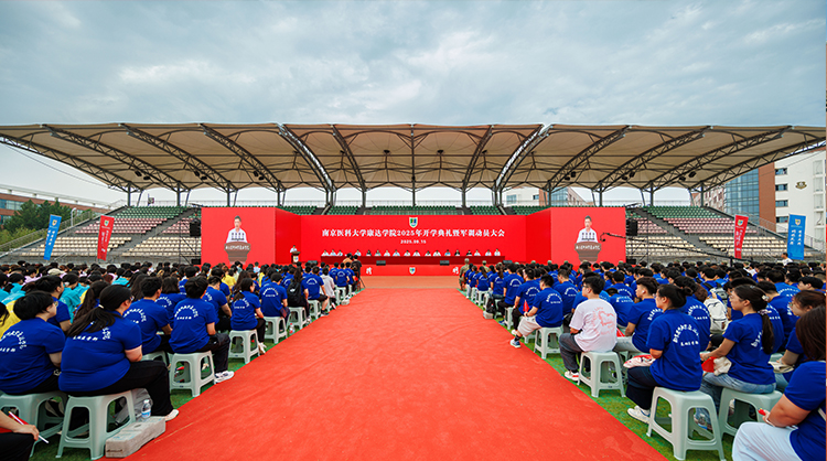 9月15日上午,我院在风雨操场举行2025年新生开学典礼暨军训动员大会。南京医科大学校长胡志斌连云港市人民政府副市长张家炯副秘书长贺贵才南京医科大学副校长沈历宗、刘云,中国人民解放军空军某部中校洪涛南京医科大学相关职能部门负责人,连云港市教育局卫生健康委员会相关领导学院全体院领导、附属医院主要领导出席开学典礼。学院各学部、部门、直属单位负责人,师生、家长代表和全体新生共4000余人参加开学典礼。典礼由副校长沈历宗主持。