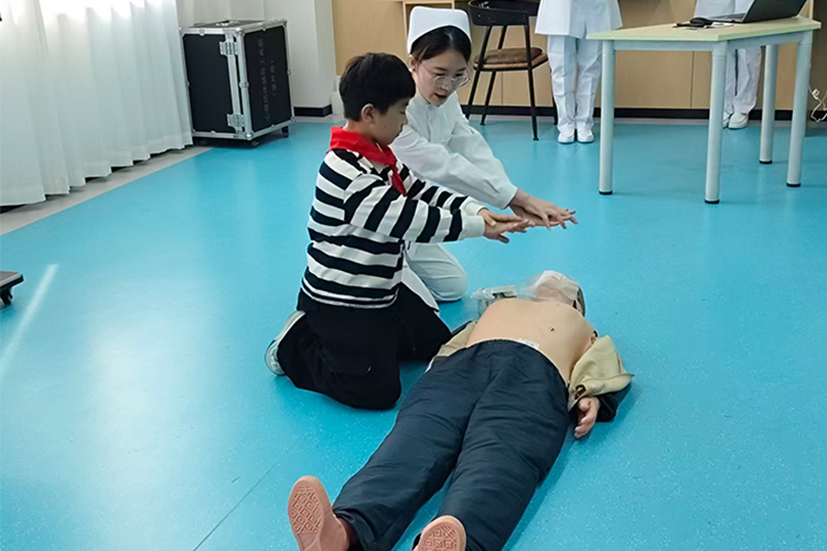 随后,同学们走进生命科学馆,在大学生讲解员的引导下,同学们了解了生命的起源与人体构造,沉浸式探索生命的奥秘。在大学生心理健康教育中心,护理学部志愿者为小学生们演示并讲解了心肺复苏术与海姆立克急救法的技能知识及操作要领同学们在指导下进行实操练习,初步掌握关键救护技能。青春健康俱乐部志愿者则通过互动游戏,帮助孩子们树立身体保护意识,科学认识艾滋病防治知识,学会做自己身体的“小卫士”。活动最后,外国语学部王鹏宇老师为同学们带来一堂生动的医学英语小课堂,以趣味互动的方式启发同学们对医学英语的认知。