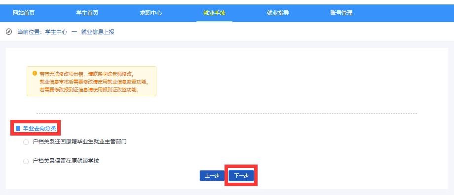 (4)根据实际就业情况,选择就业大类。目前已就业的学生可在前 6 项中选择,未就业学生可在后 2 项中选择,根据实际,逐步填写。